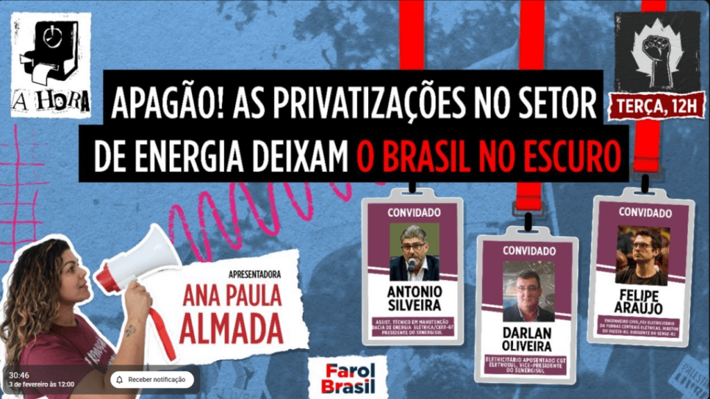 Felipe Araújo (Furnas Centrais Elétricas), Antonio Silveira (Companhia Estadual de Geração e Transmissão de Energia Elétrica/CEEE-GT) e Darlan Oliveira (CGT Eletrosul) analisam as consequências da entrega de empresas estratégicas em entrevista ao vivo hoje